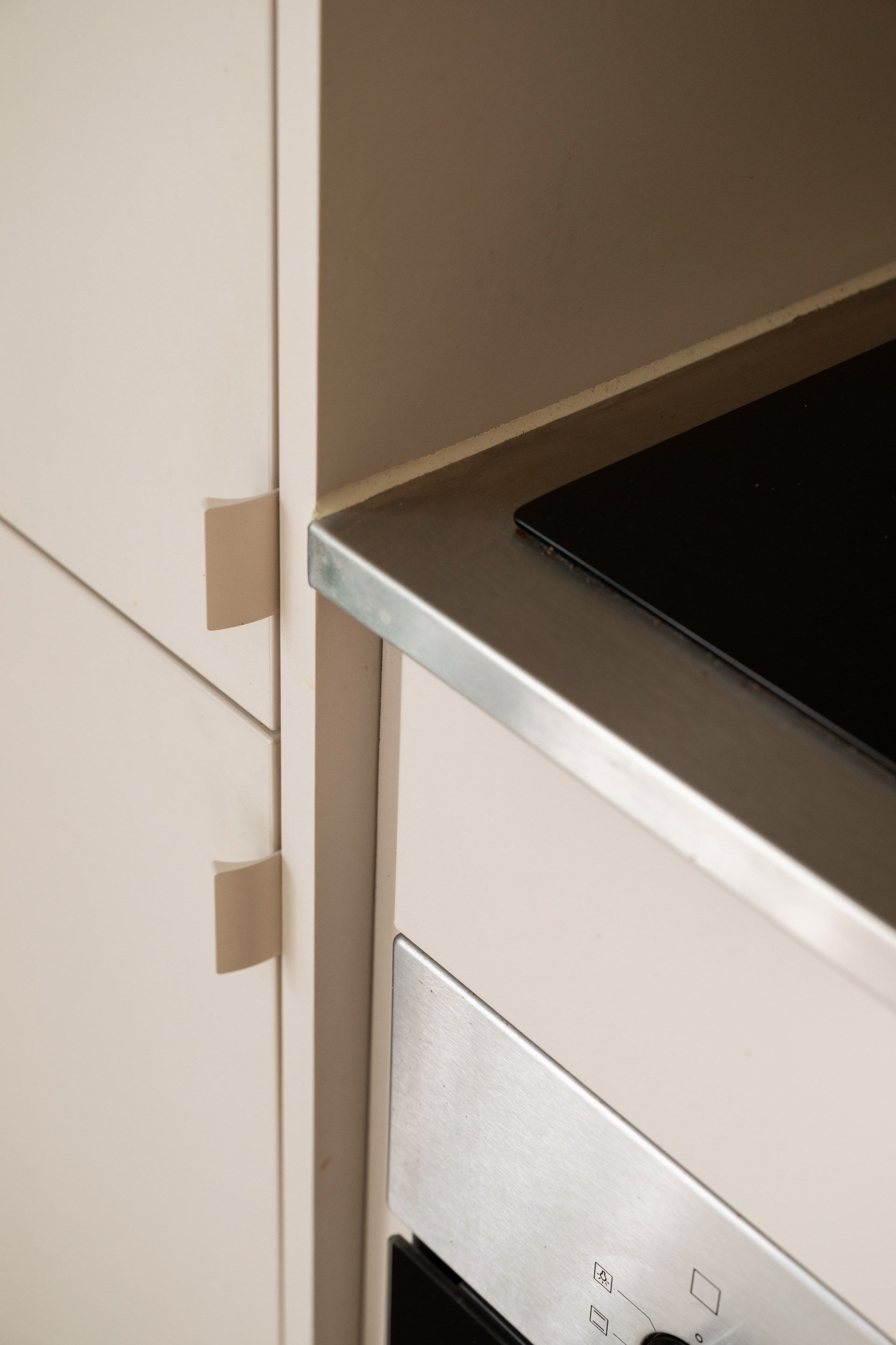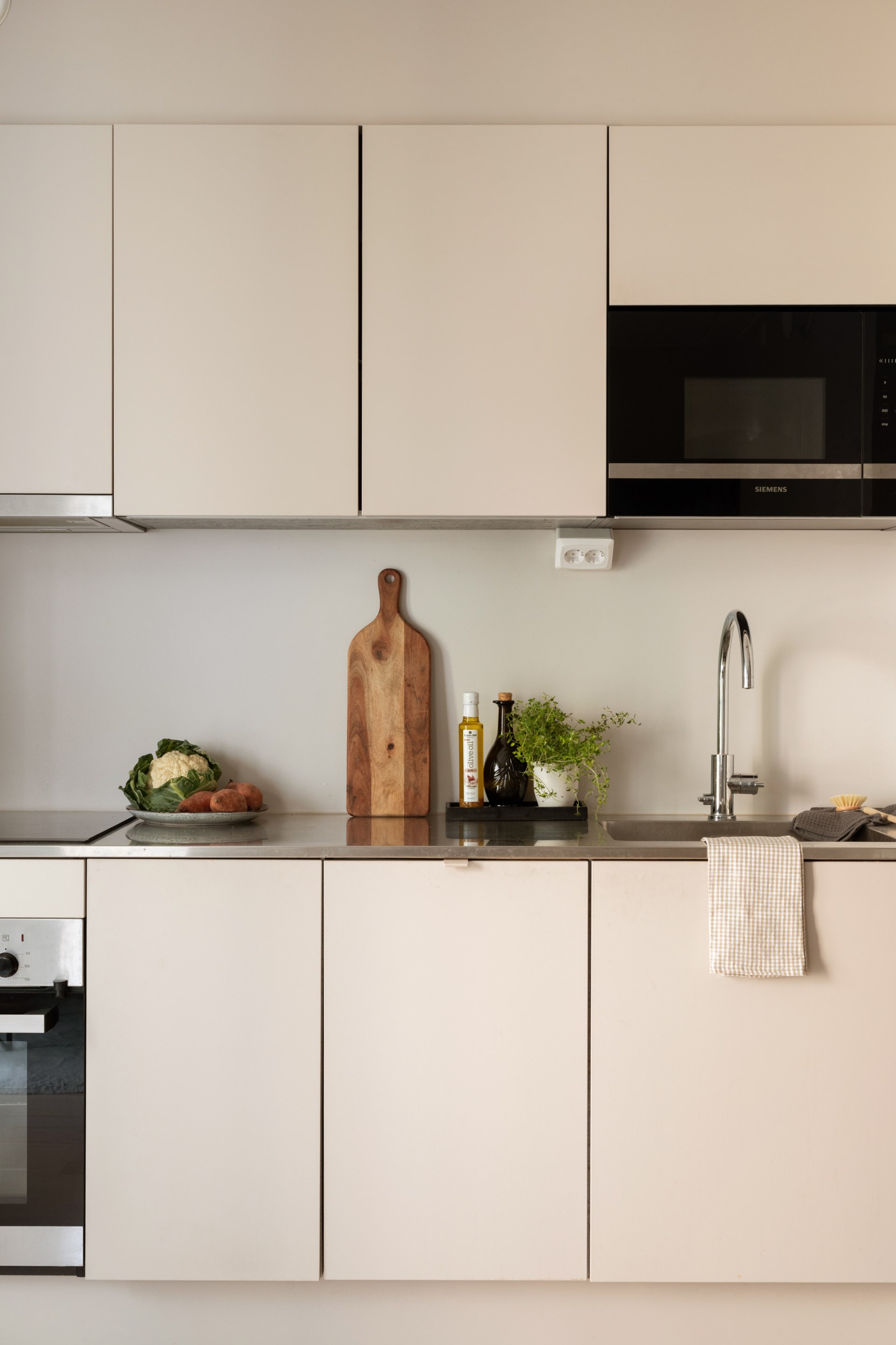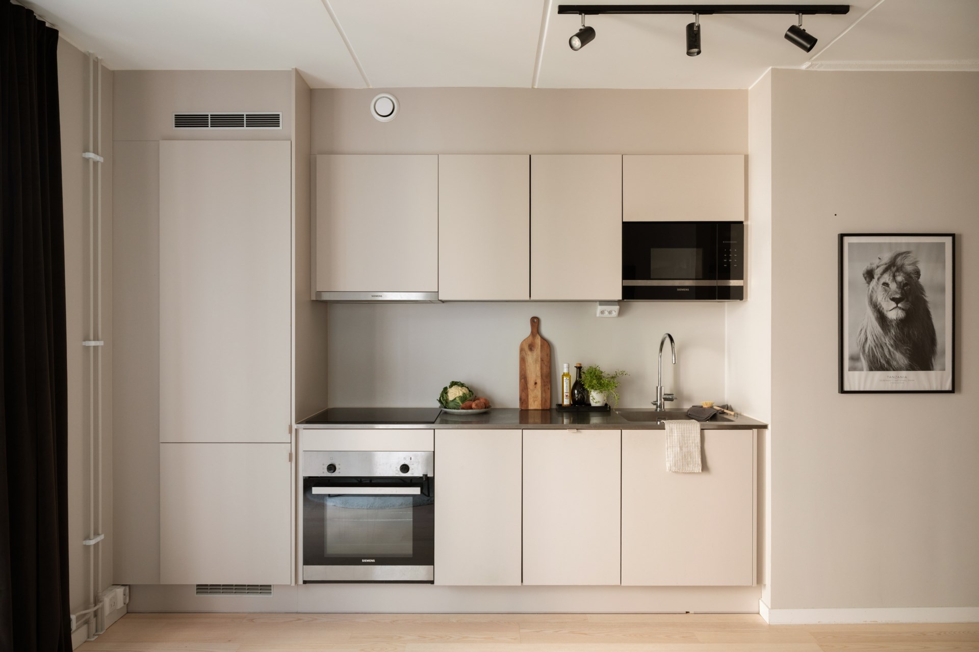 Välplanerat och smakfullt kök från Puustelli. Gott om både arbetsyta och förvaring. Gråbeige skåp och bänk i rostfritt stål med infälld induktionshäll. Diskmaskin och kyl/frys integrerade i inredningen. Ugn och inbyggd mikro i svart/rostfri design. Alla vitvaror är av märket Siemens.