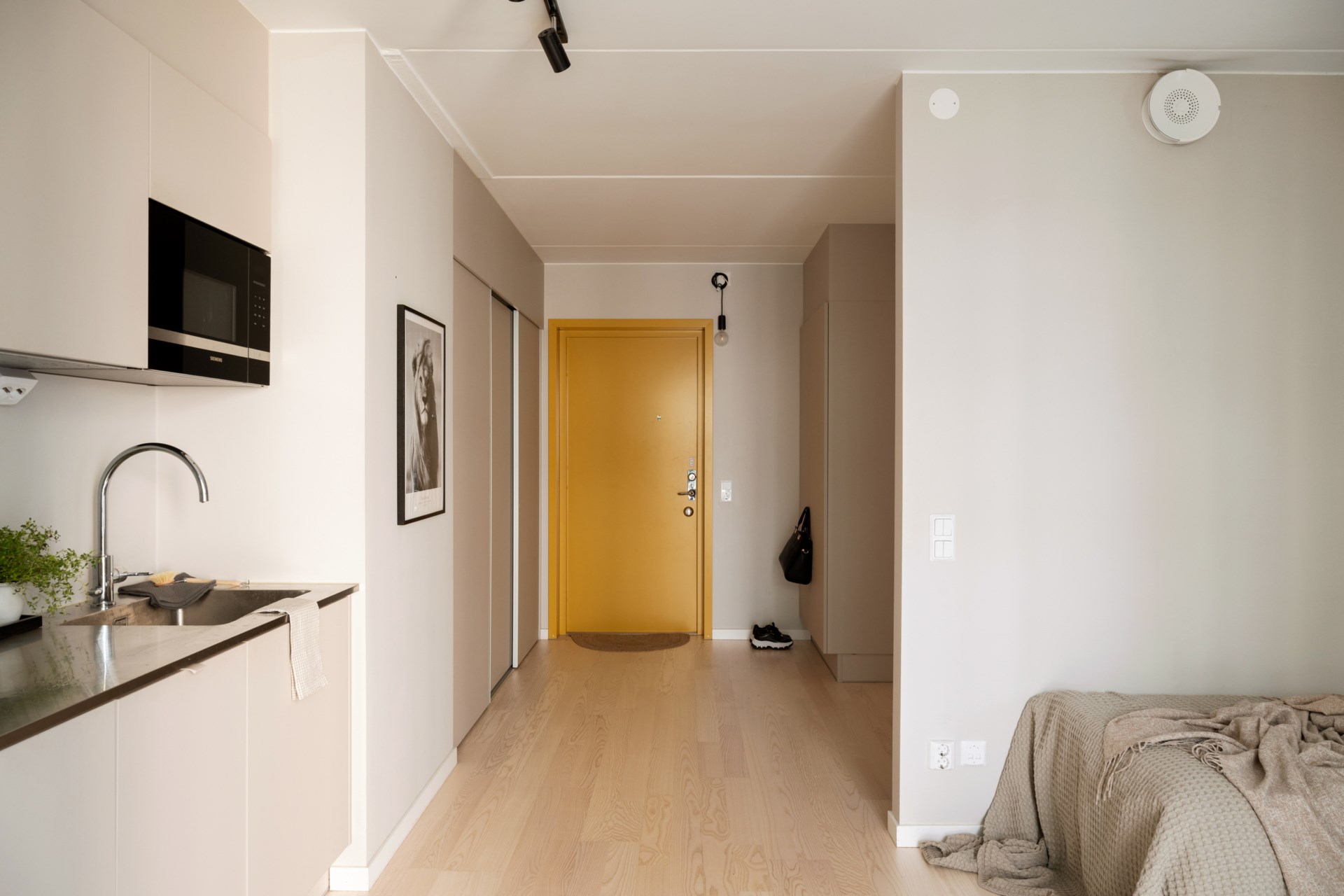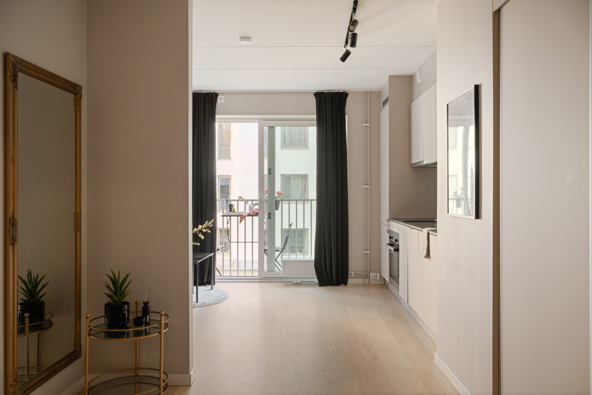 Mitt emellan Hagaparken och Mall of Scandinavia finner vi denna välplanerade etta som känns större än sina 29 kvm. Ljusinsläppet är generöst, och helglasade pardörrar i det kombinerade vardagsrummet och köket leder ut till en solig balkong med vacker utsikt över en grönskande innergård med prydlig växtlighet och flera sittplatser. Köket är utrustat med diskmaskin, och i det rymliga badrummet finns en kombinerad tvättmaskin och torktumlare. Utmärkta förvaringsmöjligheter erbjuds i form av flera garderober i hallen. Lägenheten färdigställdes 2021 med smakfulla färg- och materialval, och är fortfarande i så gott som nyskick.