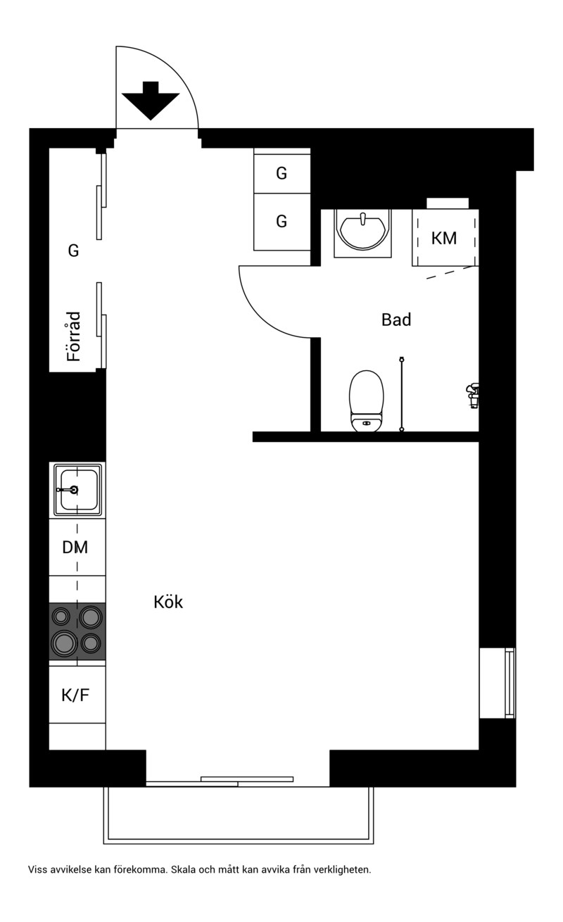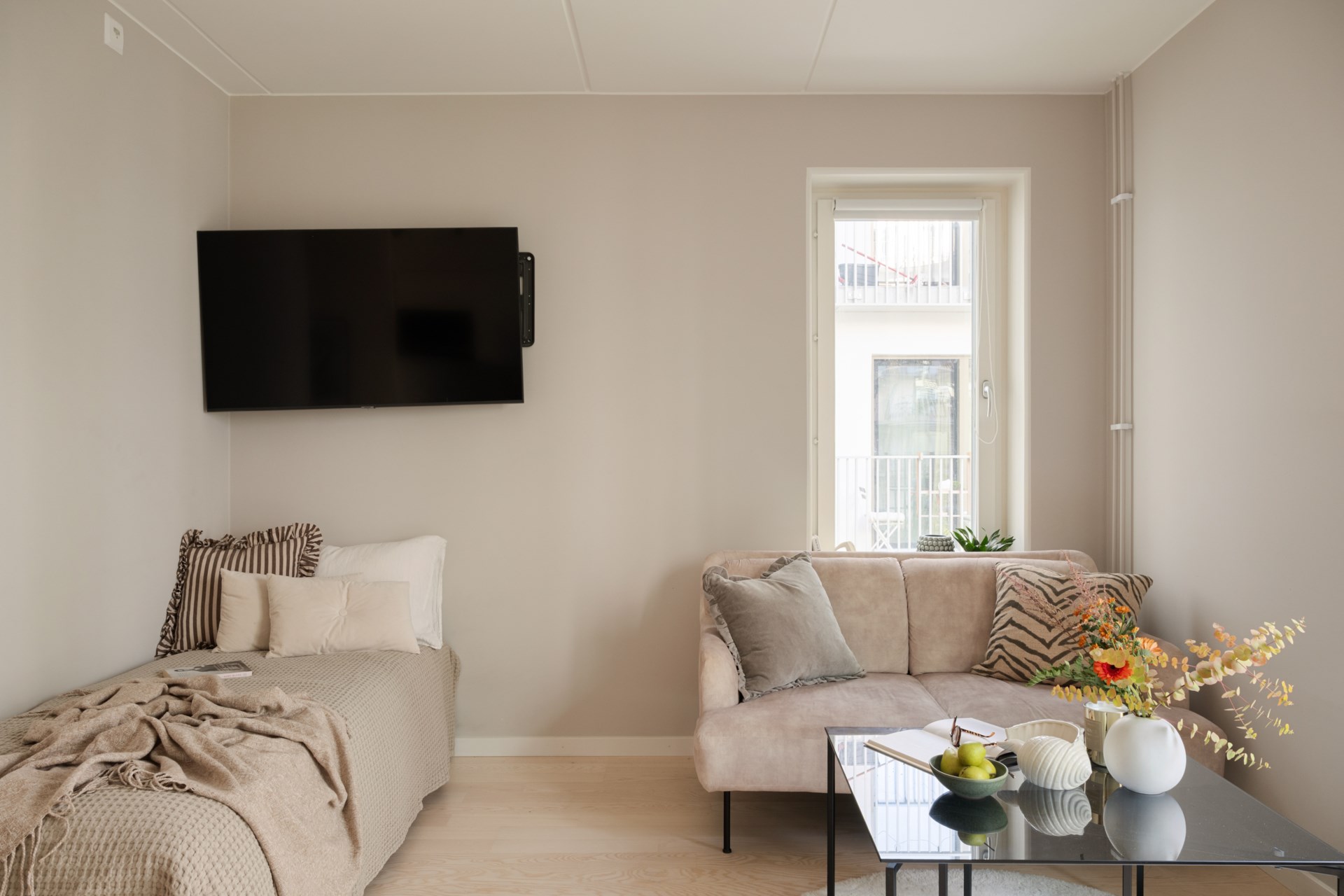 Vardagsrum och kök i kombination. Ljusinsläpp från fönster åt ett håll och helglasade balkongdörrar åt ett annat. Fin utsikt över föreningens innergård. Utrymme för både soffa, säng och matbord. Plats för ett kaféset eller dylikt på balkongen. Väggarna är målade i gråbeige och golvet belagt med tvåstavsparkett i ask.