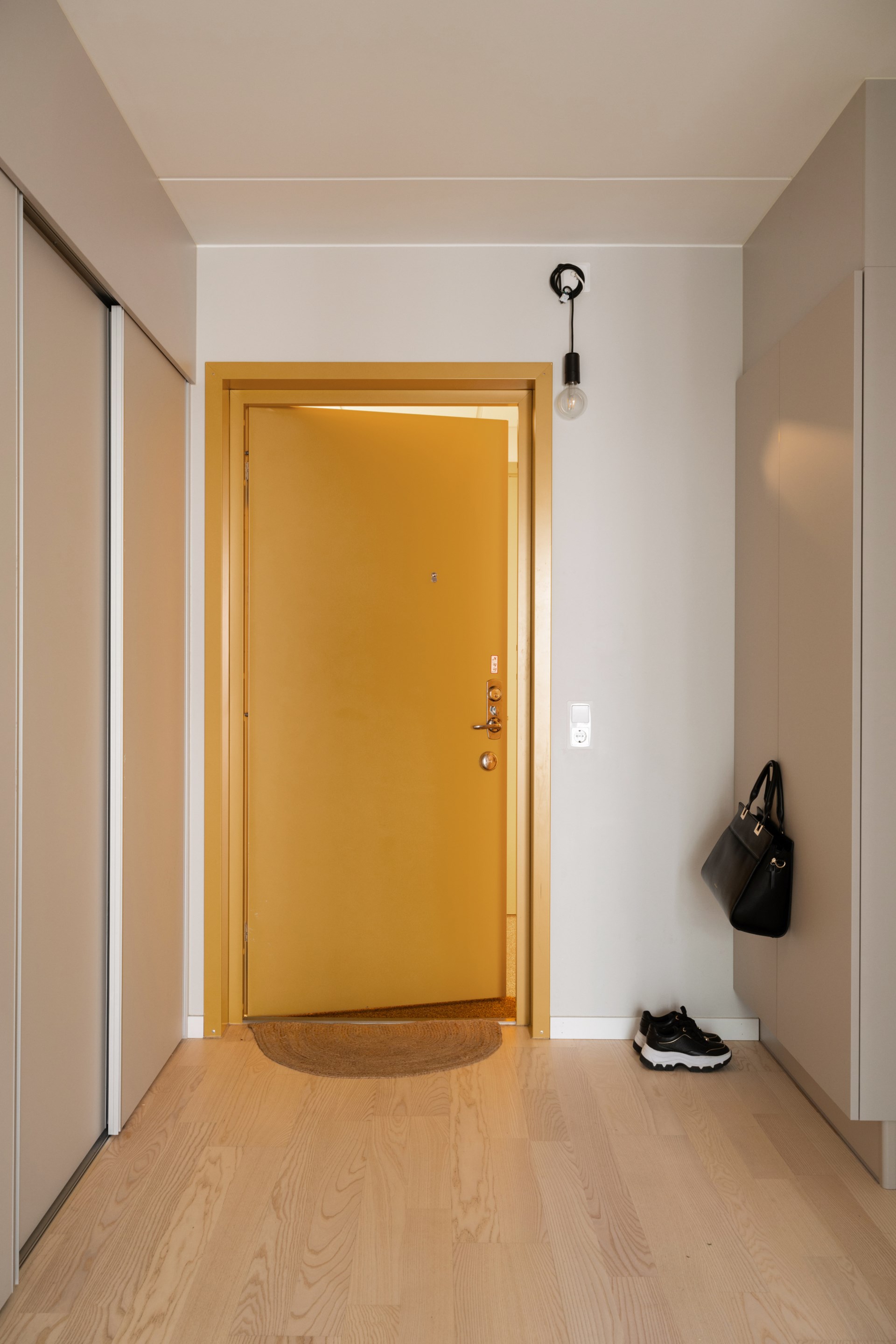 Välkomnande hall med ypperliga förvarings- och avhängningsmöjligheter i form av en platsbyggd dubbelgarderob och en inbyggd garderobsvägg med skjutdörrar. Väggarna är målade i gråbeige och golvet belagt med tvåstavsparkett i ask. Ljuddämpande säkerhetsdörr.