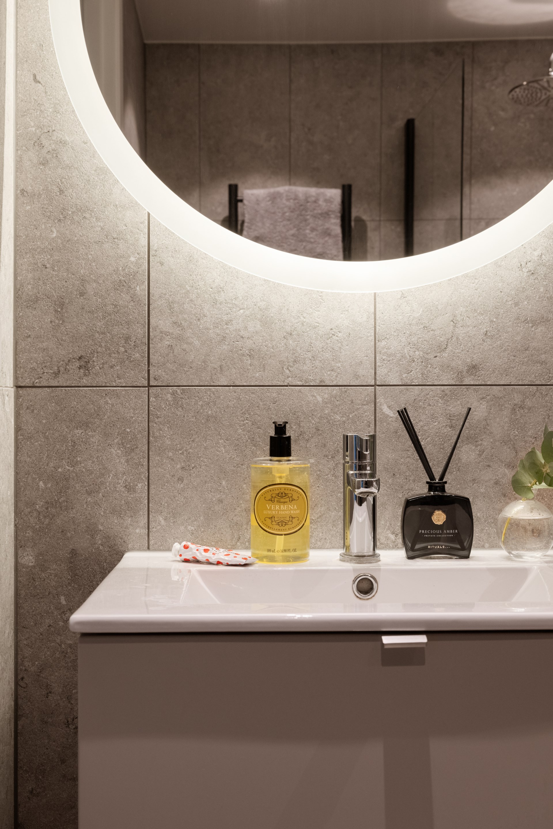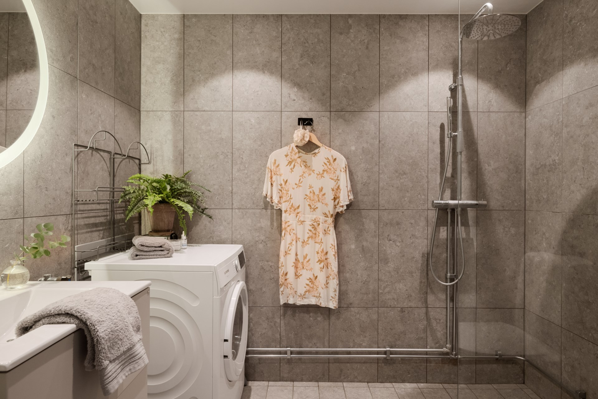 Rymligt badrum med takdusch, handdukstork, tvättkommod och toalett. Kombinerad tvättmaskin och torktumlare från Siemens. Väggkakel och golvklinker i grå granitkeramik. Dimbara takspottar och rund spegel med backlight-belysning.