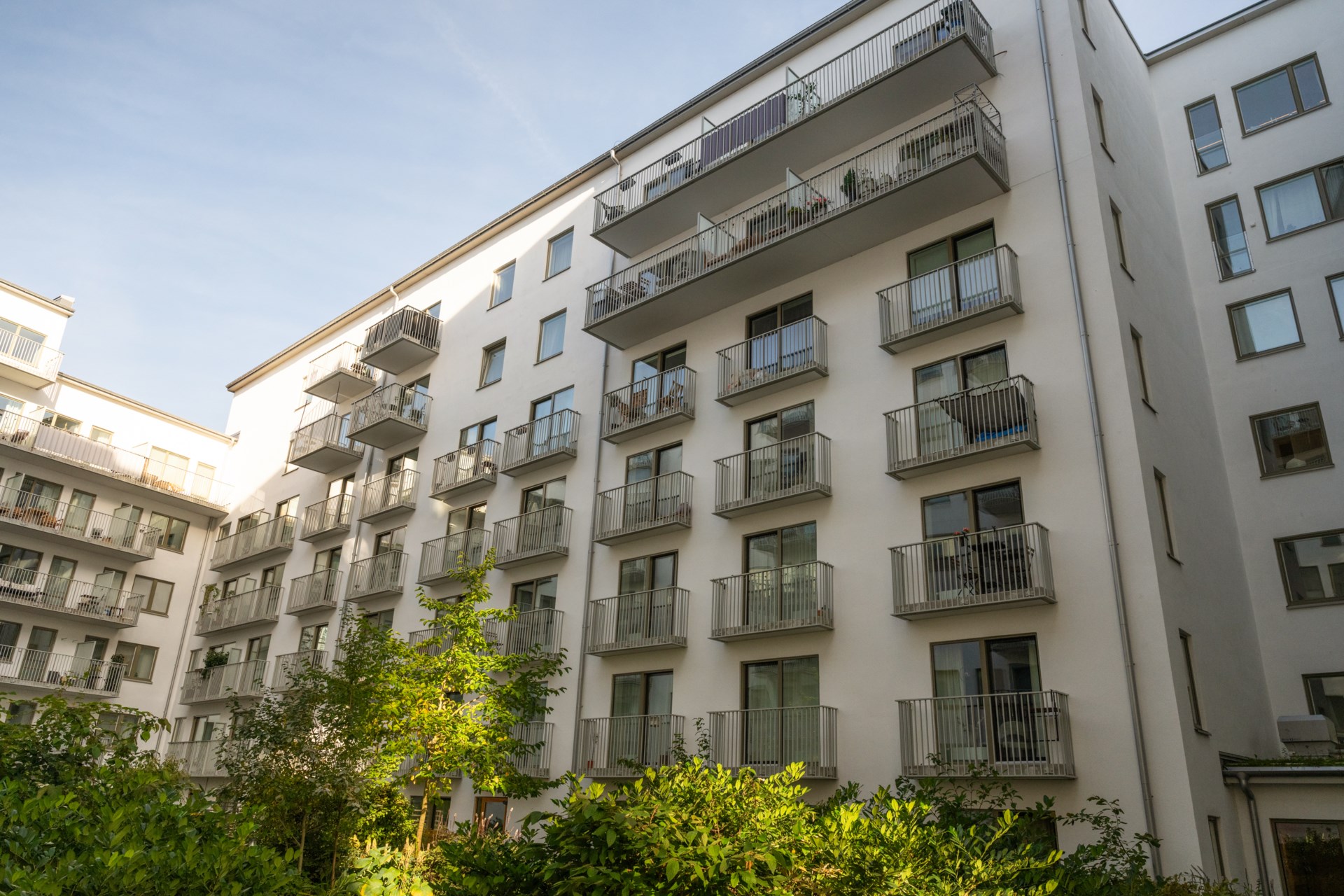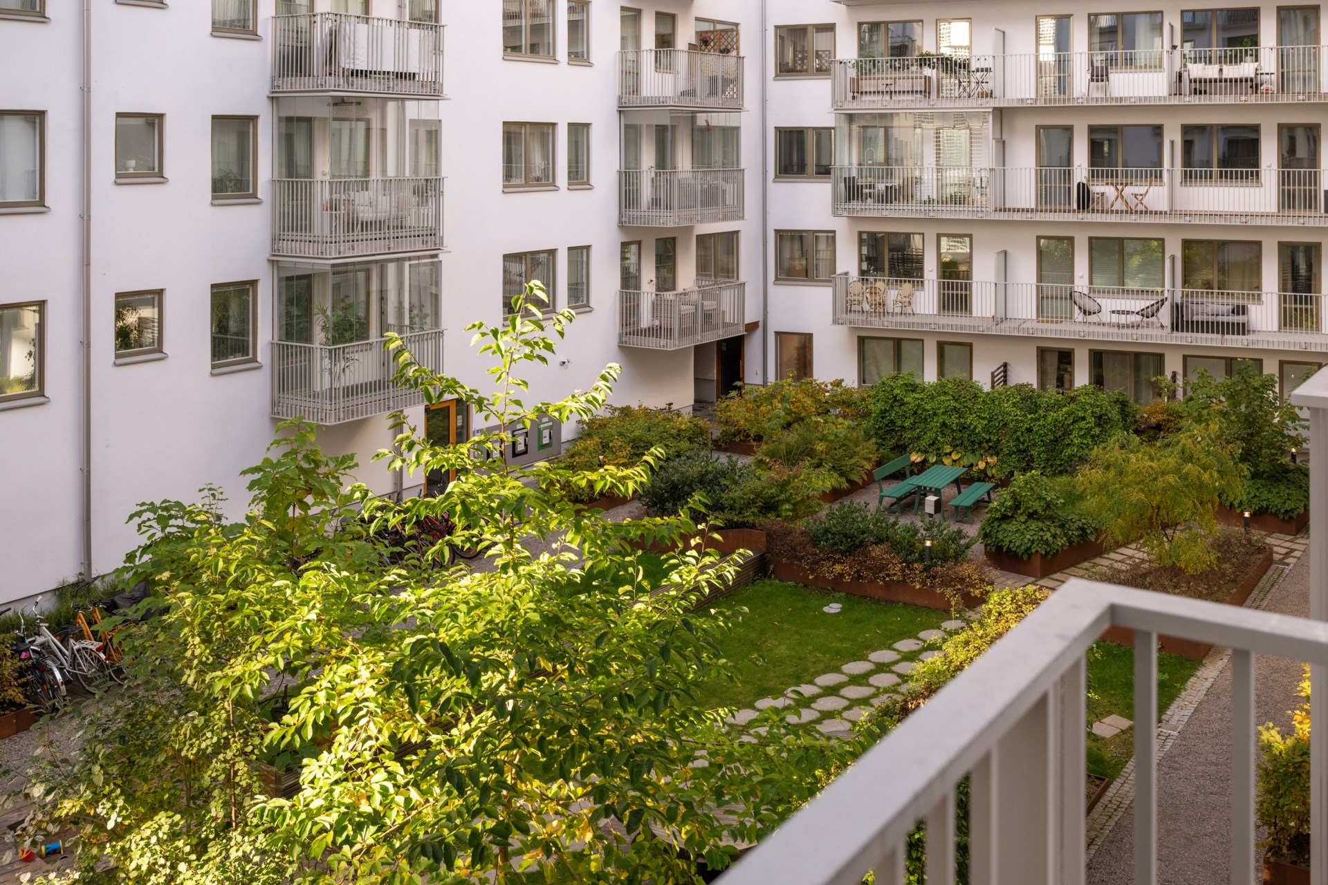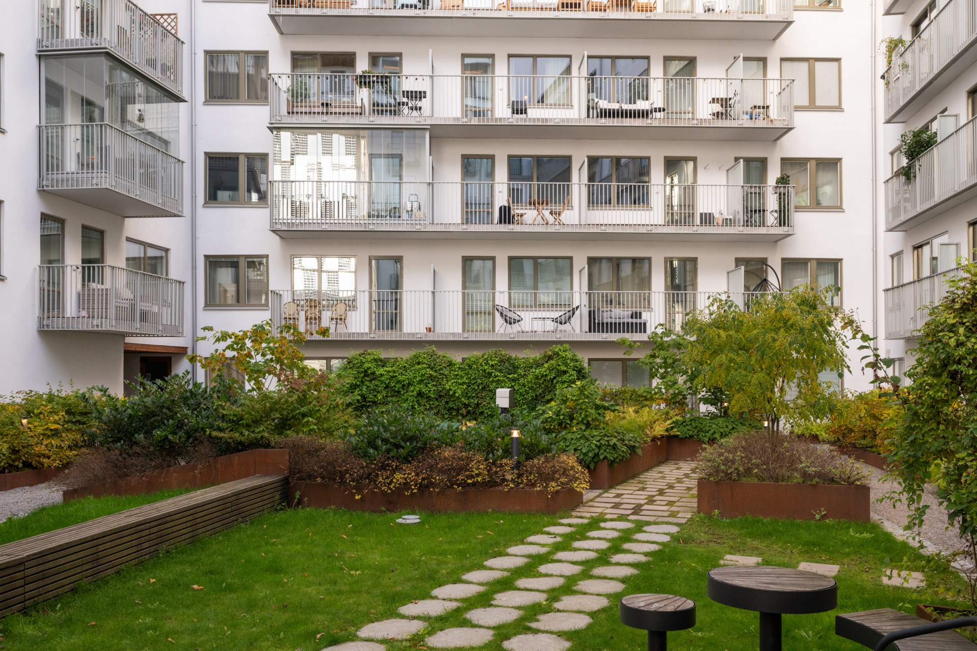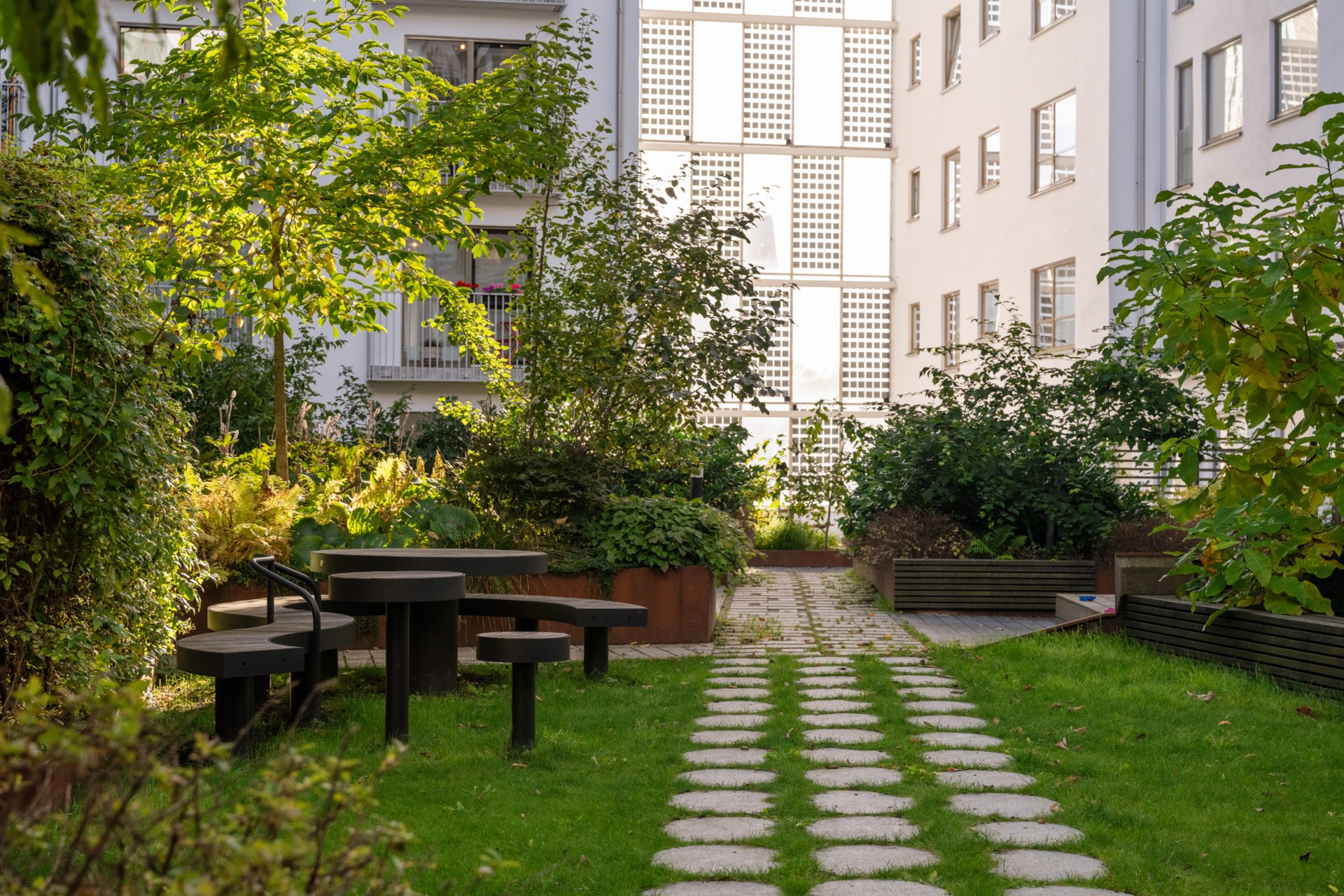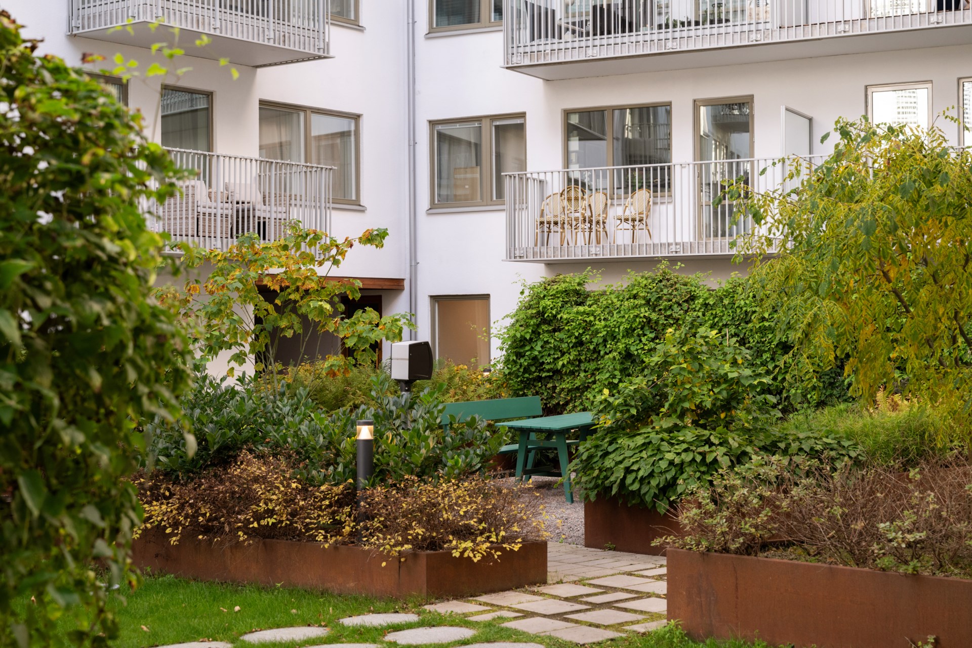 Grönskande innergård med prydlig växtlighet och flera sittplatser. Möblerad takterrass med grill.