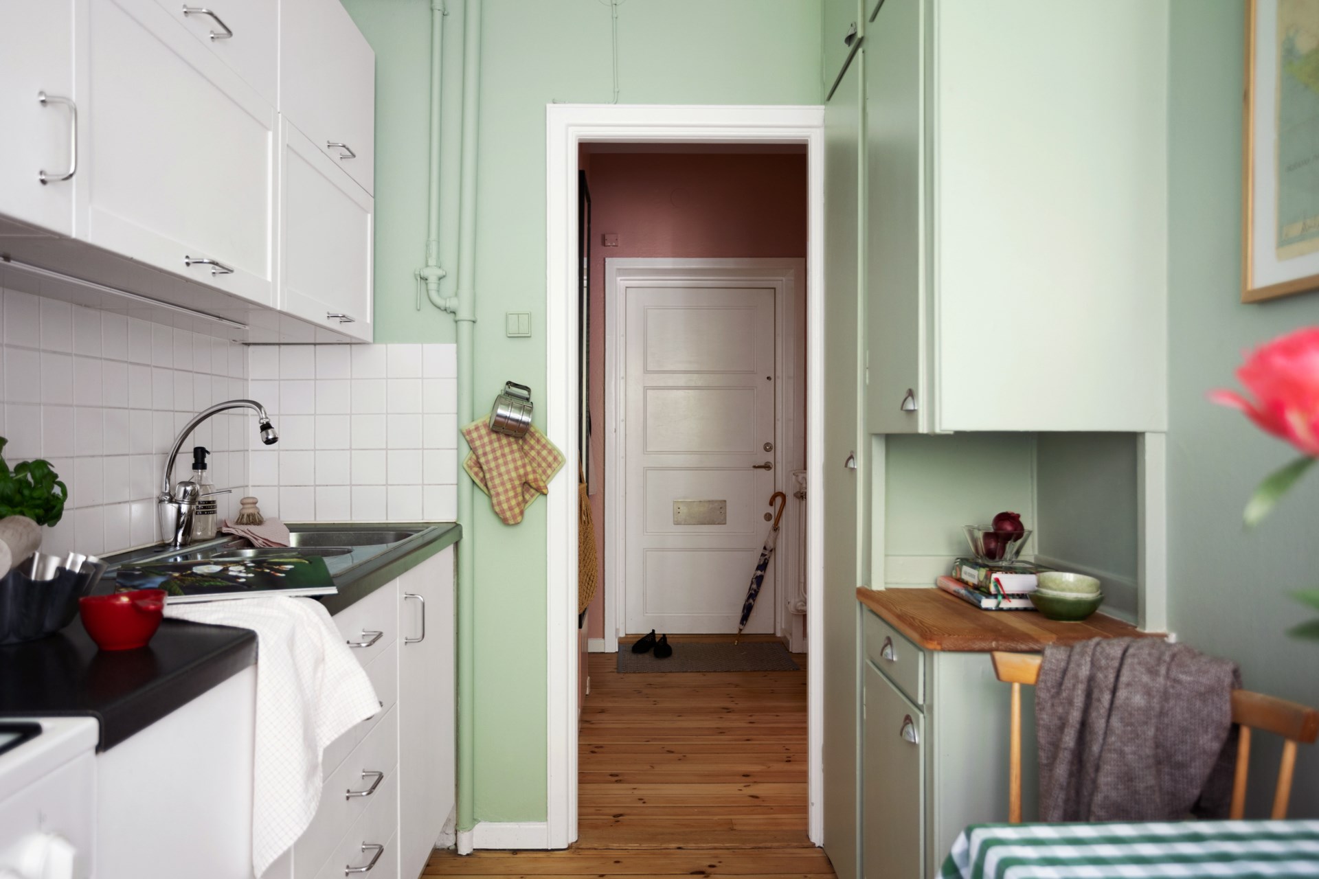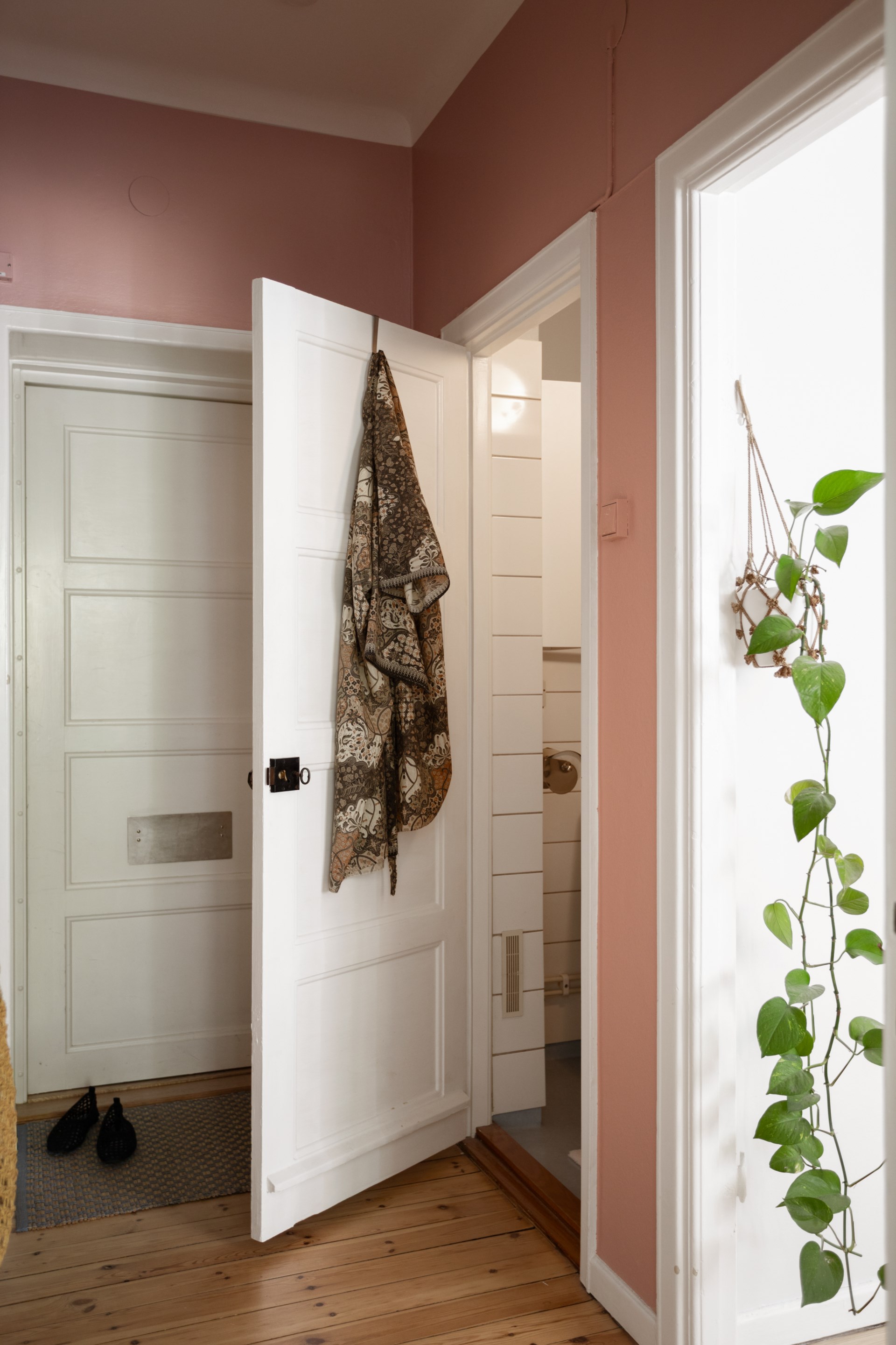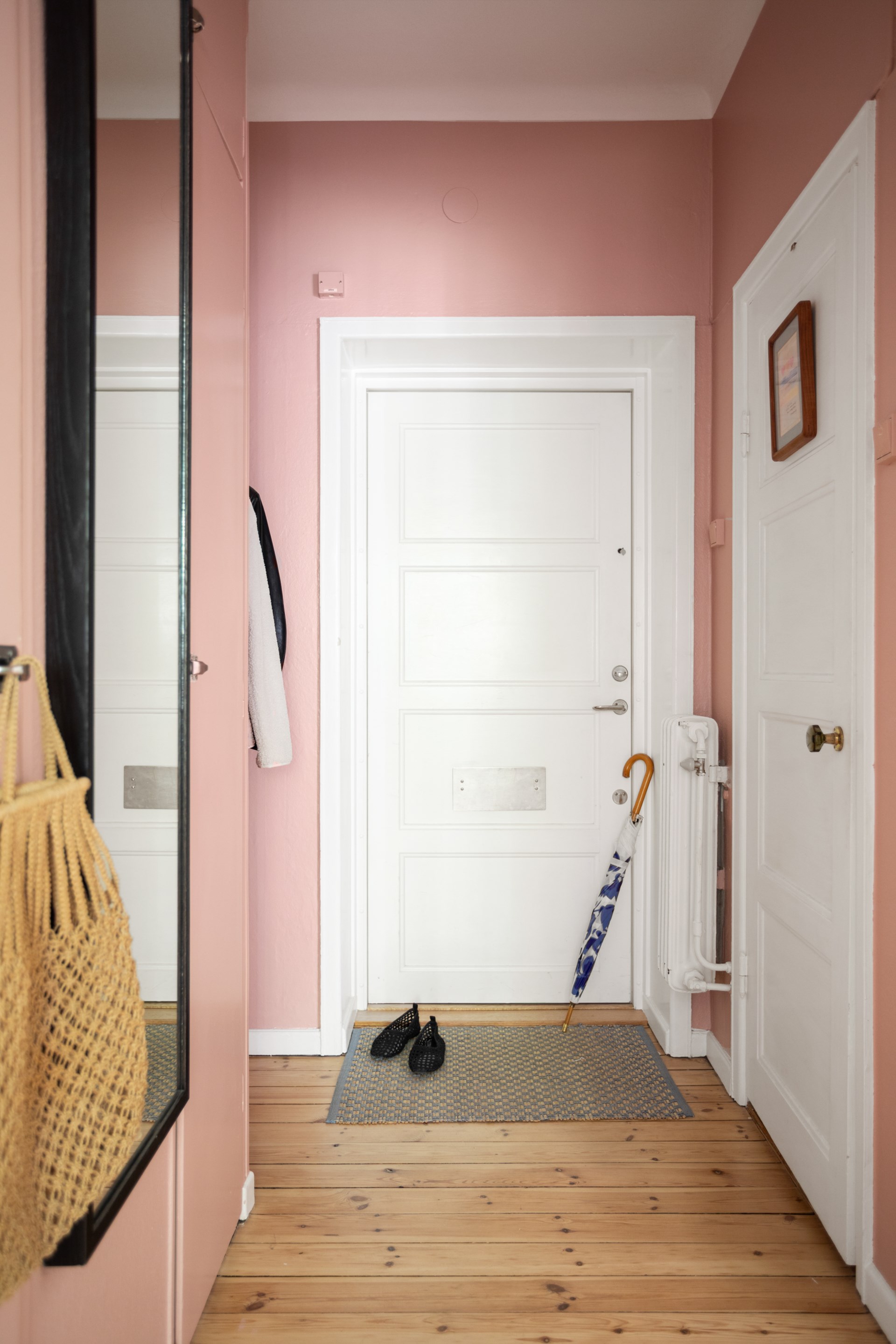 Välkomnande hall med hatthylla och skohylla. Två stora garderober för klädförvaring. Brädgolvet är framtaget och väggarna målade i rosa.