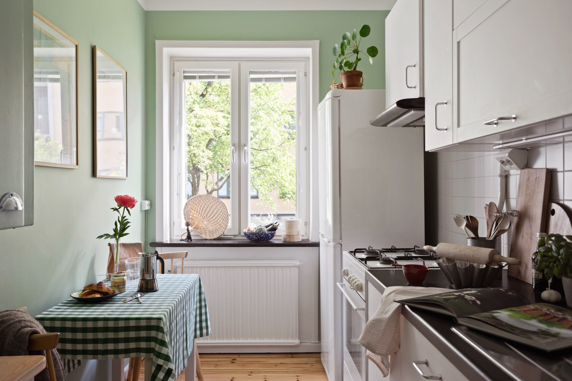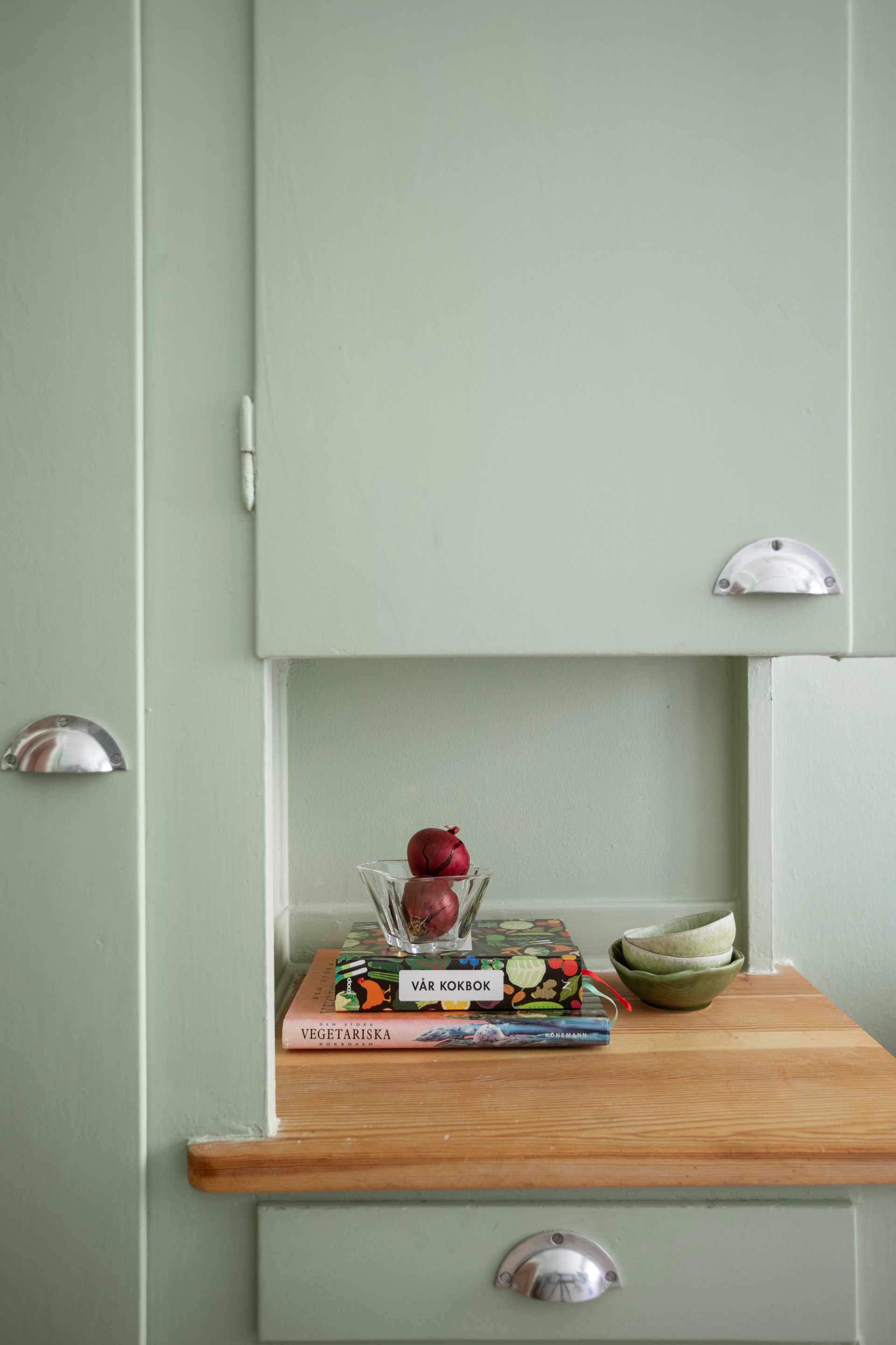 Välplanerat och charmigt kök med serveringsskåp och skafferi i original från byggnadsåret. Gott om arbetsyta och förvaring. Vita skåp och bänk i mörkt laminat. Vitt kakel. Köket är utrustat med gasspis, fläkt och kyl/frys. Brädgolvet är framtaget och väggarna målade i ljusgrönt.