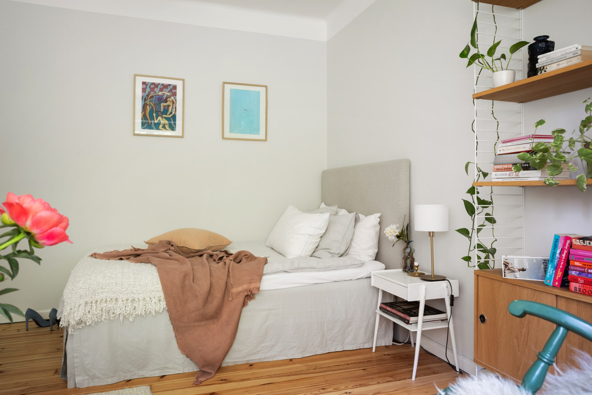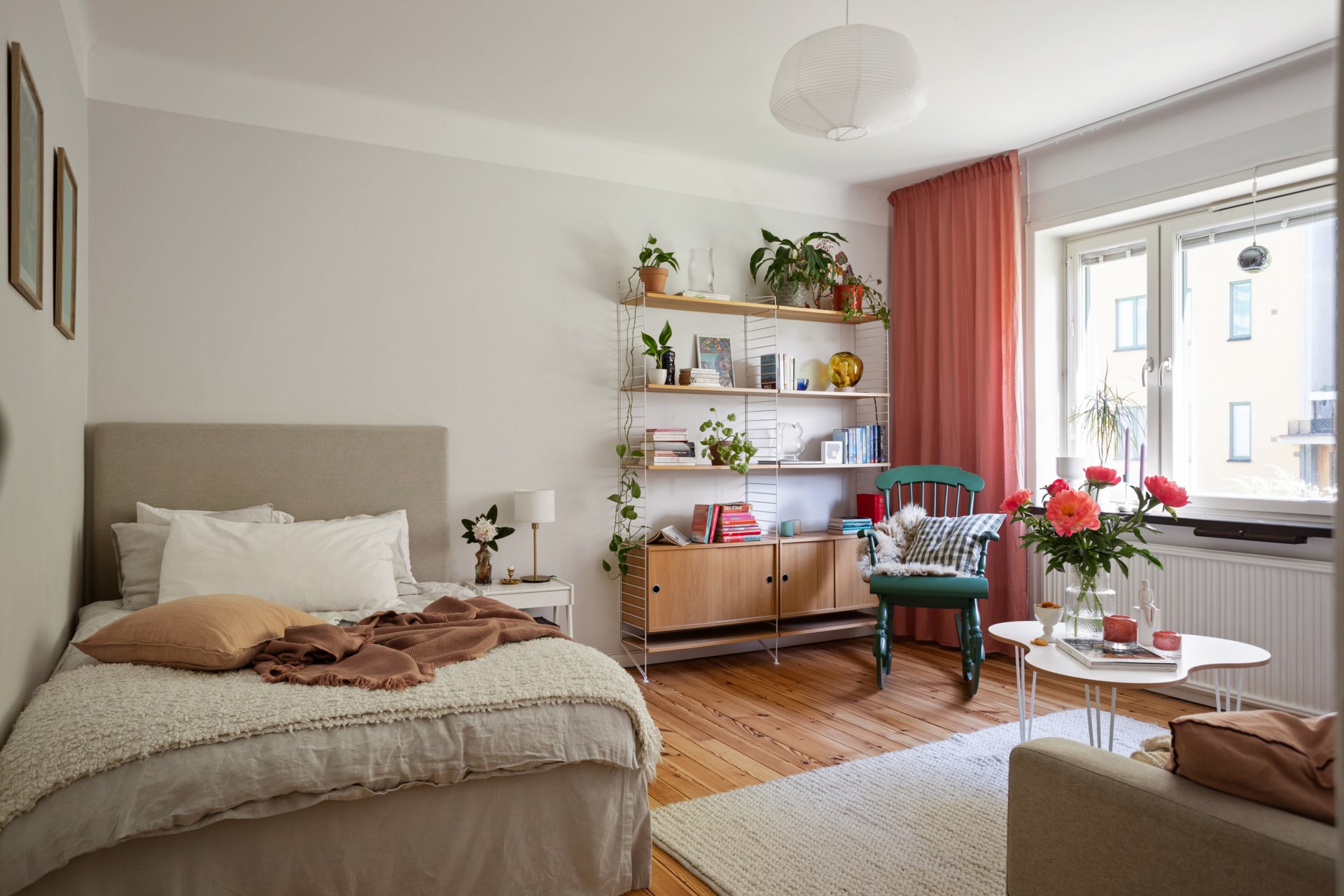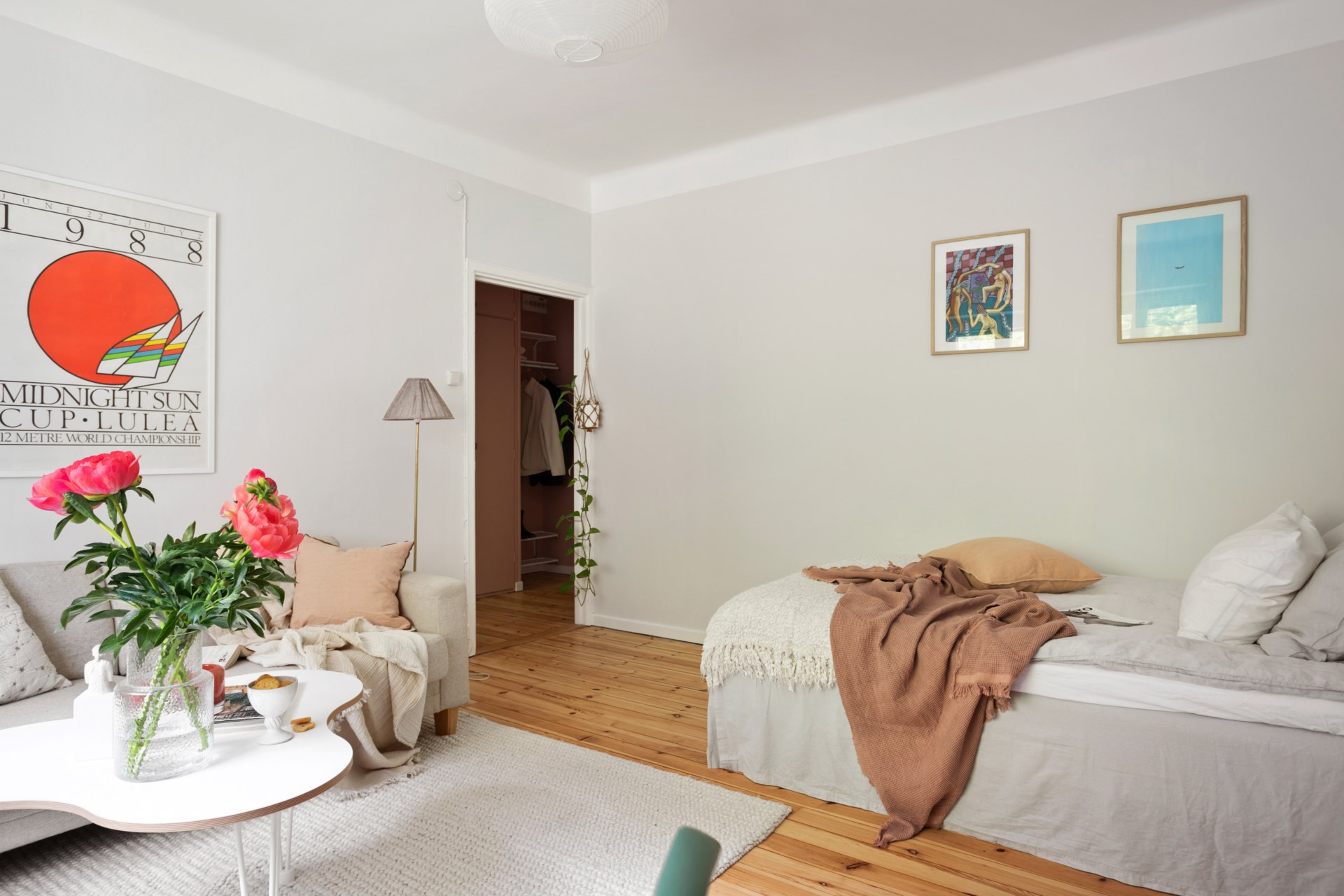 Ljust och inbjudande vardagsrum med en takhöjd på 2,70 som skapar en luftig känsla. Gott om plats för exempelvis säng, soffa, skrivbord och bokhylla. Väggarna, som möter taket i en välvning, är målade i den ljusgrå kulören "Snäcka". Framtaget brädgolv.