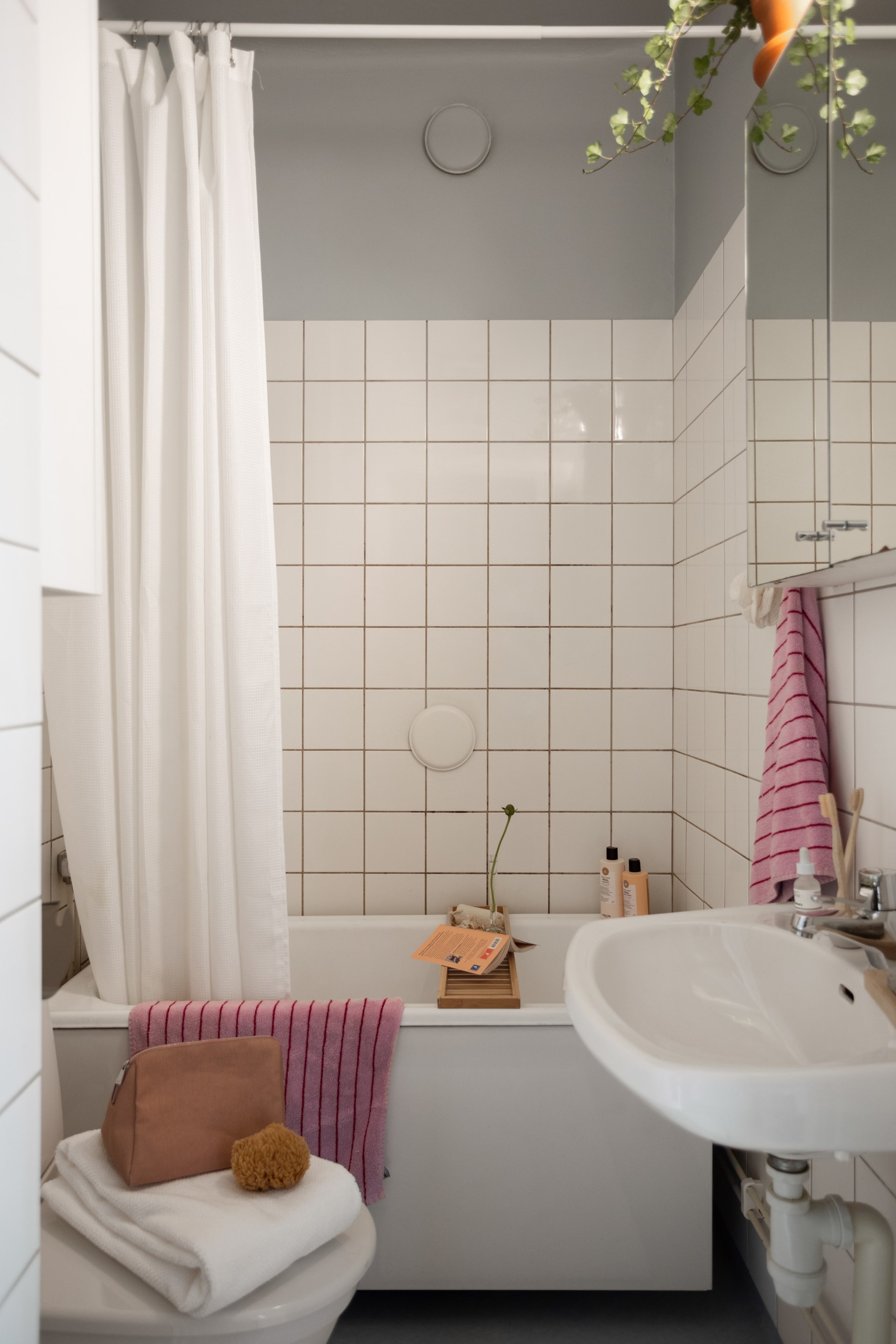 Badrum med badkar, handdukstork, tvättställ, spegelskåp, väggskåp och WC. Vitt kakel och ljusblå våtrumsmatta.