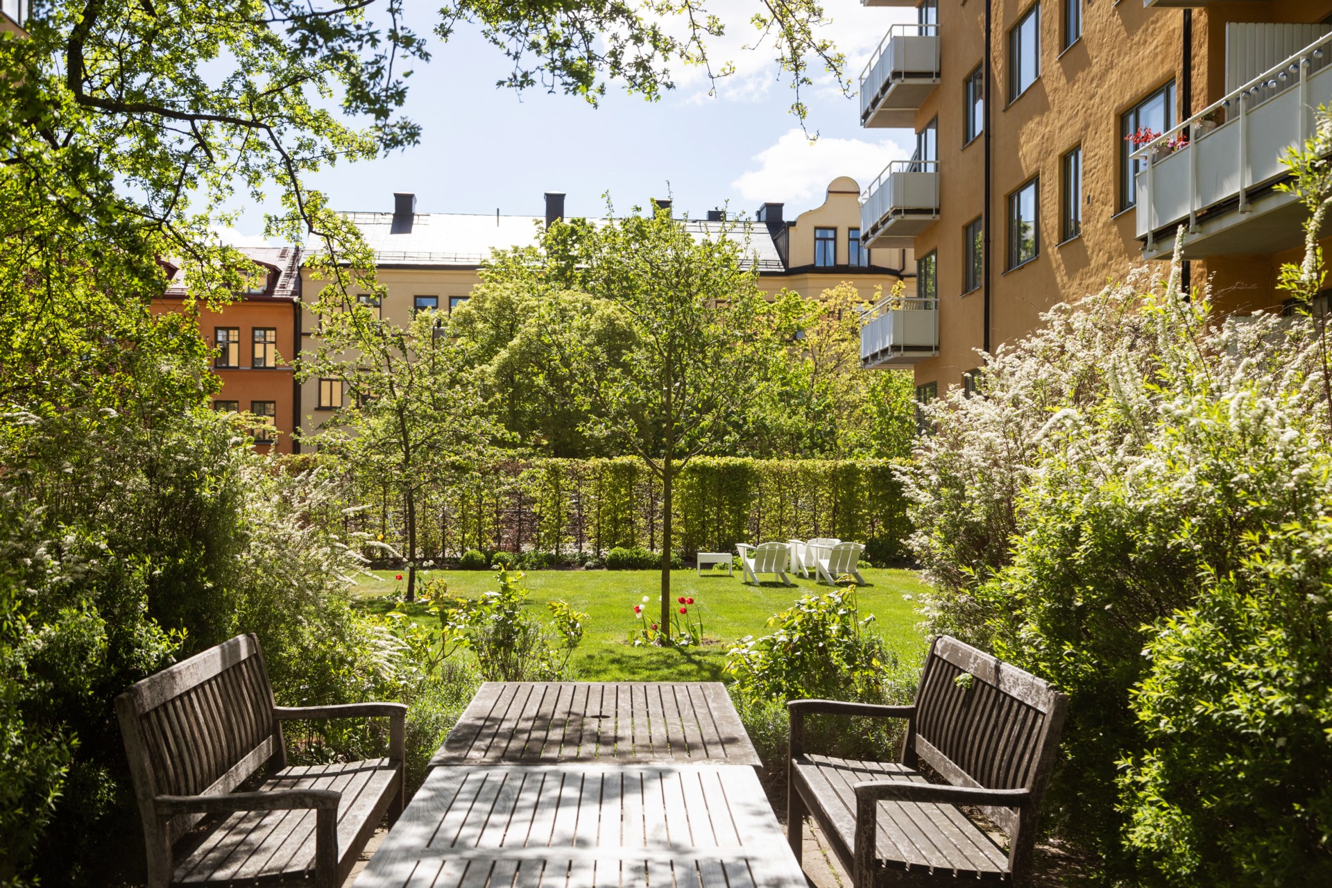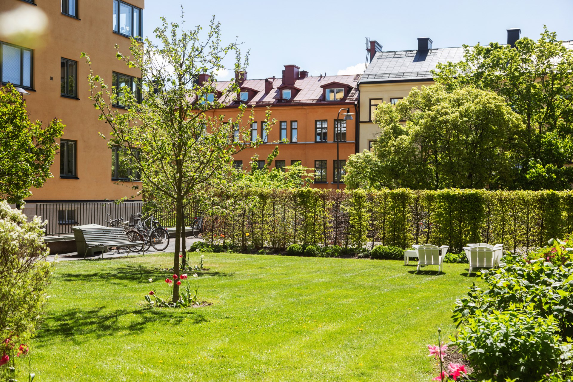 Väl omhändertagen gårdsmiljö med utemöbler, grillplatser och lekplats. Planteringar och grönytor sköts av trädgårdsmästare.